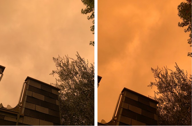 I don’t live in a place whose sky is flushed by fire, so I asked the author Robin Sloan, who lives in Oakland, California, to take photos illustrating the phenomenon. The image on the left, below, is from the iOS camera. The one on the right was taken with the Halide app, which lets you change exposure settings manually, including white balance.